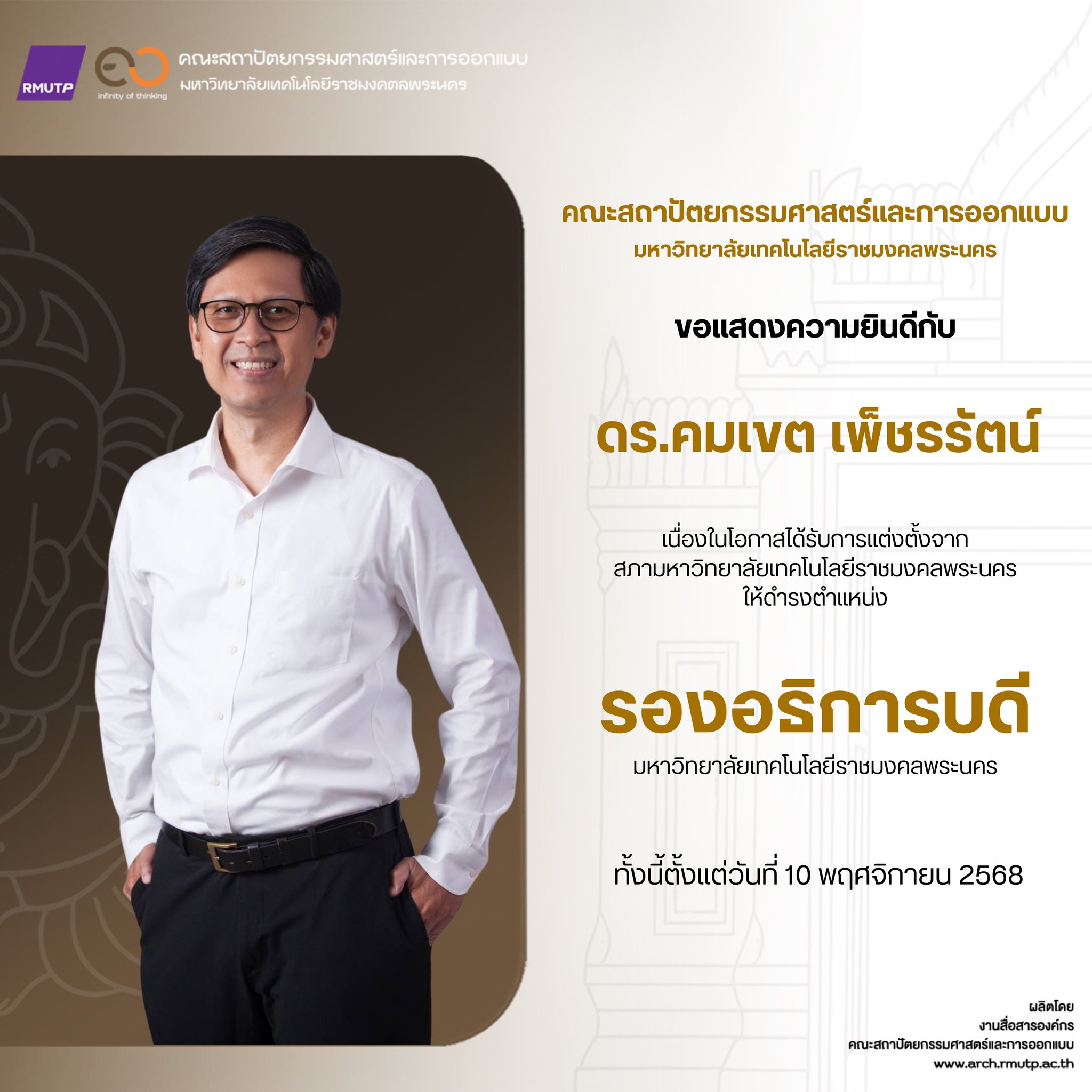 ข่าวประกาศจากทางคณะ ขอแสดงความยินดีกับ ดร.คมเขต เพ็ชรรัตน์ เนื่องในโอกาสได้รับแต่งตั้งเป็น “รองอธิการบดี” Posted 07/11/202517/11/2025 admin ขอแสดงความยินดี คณะสถาปัตยกรรมศาสตร์และการออกแบบ ราชมงคลพระนคร ขอแสดงความยินดีกับ ดร.คมเขต เพ็ชรรัตน์ เนื่องในโอกาสได้รับแต่งตั้งเป็น "รองอธิการบดี มหาวิทยาลัยเทคโนโลยีราชมงคลพระนคร".ประกาศ ณ วันที่ 7 พฤศจิกายน 2568 และให้ปฏิบัติหน้าที่ ตั้งแต่วันที่ 10 พฤศจิกายน 2568 Post Views: 12