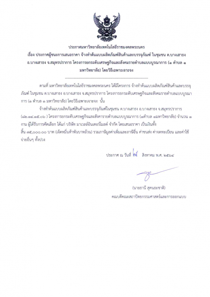 รับสมัครงาน/จัดซื้อ/จัดจ้าง ประกาศผู้ชนะการเสนอราคา จ้างเหมาทำต้นแบบผลิตภัณฑ์สินค้า OTOP โครงการ 1 ตำบล 1 มหาวิทยาลัย ตำบลบางเสาธง จังหวัดสมุทรปราการ Posted 25/08/202126/08/2021 admin Post Views: 319